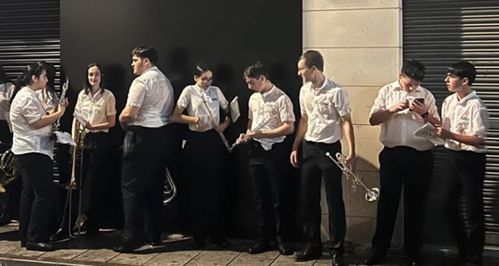 Pasábamos por la plaza Sagasta con una escuadra que nos seguía a bastante distancia, pues algunas abandonaron. A la altura de la tribuna principal, pude observar la escuadra retrasada, sin poder precisar quiénes era. Sí me consta que los números 35 y 36 del orden de marcha, Los Cracks y Pepi Hernández respectivamente, también lo hacían, como así me lo confesaron algunos de sus componentes; los primeros citados, llegaron a improvisar, con sus voces, determinados instrumentos que acompañaban a la interpretación coral que hicimos tantas escuadras.